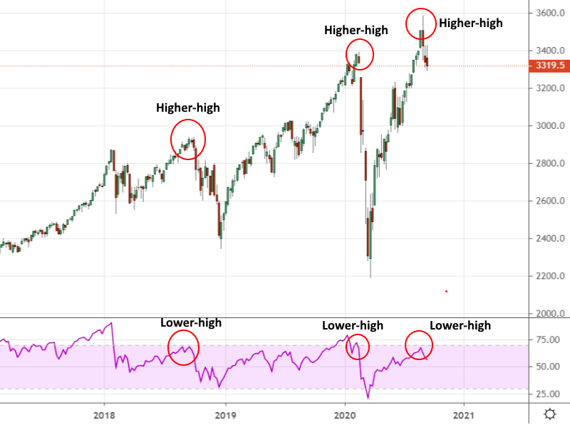 Above you can see the RSI divergence on the S&P 500, along with the previous two divergences we’ve witnessed. The first of which, back in September of 2018, led to a 20% drawdown. The second, during the first wave of the coronavirus, led to a 35% drawdown. It remains to be seen whether this latest one will follow suit, but it’s definitely something to keep an eye on. Particularly since we’re seeing the same divergence across US indices and at a longer timeframe. Could this be the next catalyst for increased market volatility? It’s certainly an intriguing candidate.